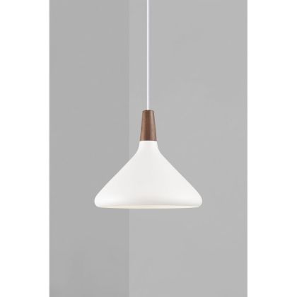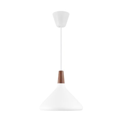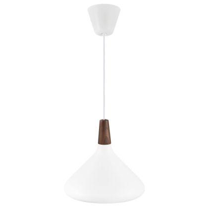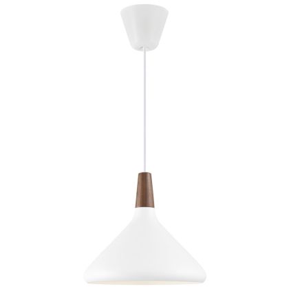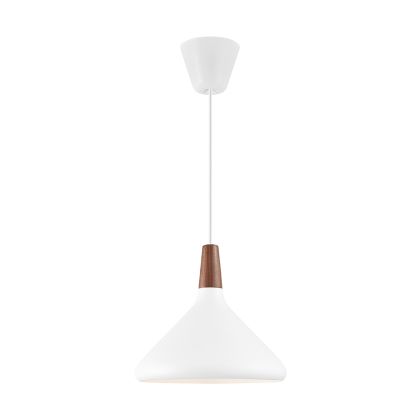 Die Nordlux Pendelleuchte aus der Modellreihe Nori zeichnet sich durch ein modernes Design und einen schicken Materialmix aus. Der Lampenschirm besteht aus Metall. Das Markenzeichen der Modellserie ist die Holzspitze in geöltem Nussbaum. Hinweis: Die Leuchte kommt ohne Leuchtmittel daher - passende E27 LED-Lampen finden Sie jedoch in unserem Shop.