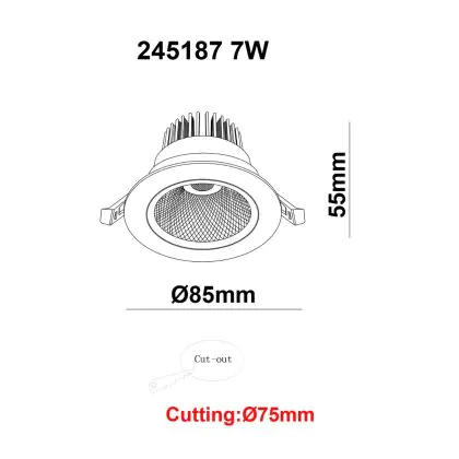 | Herstellername | White label LED Downlight Round Tiltable 7W 560lm 60D 930 UGR19 CutoutØ70mm FrameØ85mm | |