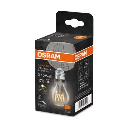Die Osram Vintage 1906 LED Classic Slim E27 Birne Fadenlampe Klar 4.8W 470lm - 827 Extra Warmweiß | Dimmbar - Ersatz Für 40W ist eine effiziente E27 LED-Lampe mit Retrodesign und der perfekte Ersatz für Ihre konventionellen 40W Lampen mit E27. Zudem strahlt sie Licht in der Farbtemperatur 2700K - Extra Warmweiß aus und punktet durch eine lange Lebensdauer.