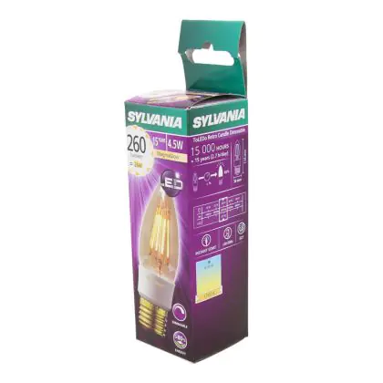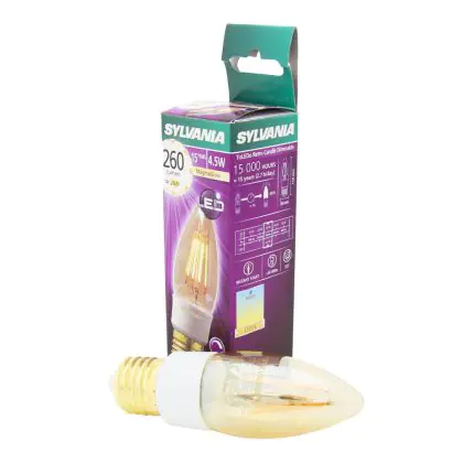 Die Sylvania ToLEDo E27 Kerze Fadenlampe Gold 4.5W 260lm - 817 Magmaglow | Dimmbar - Ersatz für 40W ist eine effiziente E27 LED-Lampe mit Retrodesign und der perfekte Ersatz für Ihre konventionellen 40W Lampen mit E27. Zudem strahlt sie Licht in der Farbtemperatur 1700K - Magmaglow aus und punktet durch eine lange Lebensdauer.